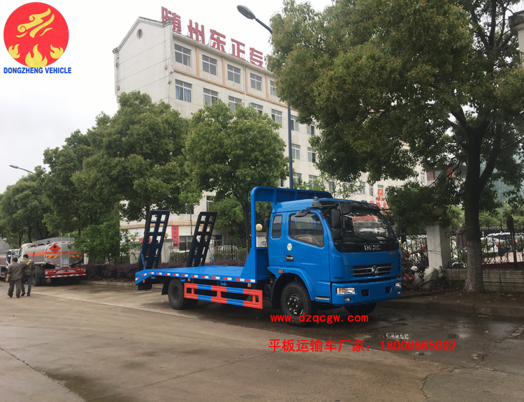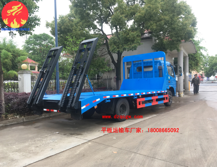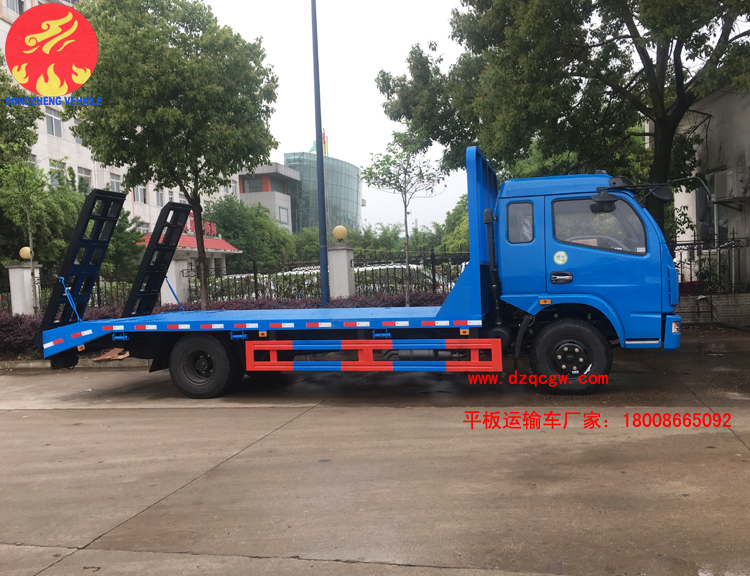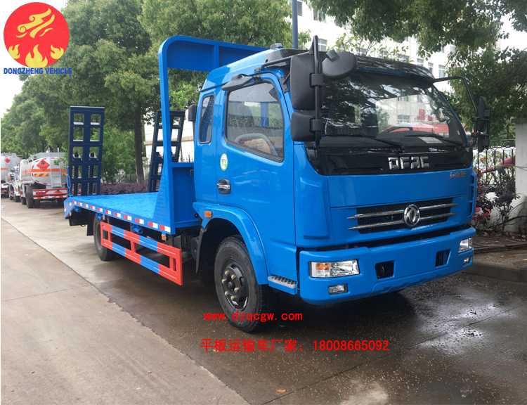 該平板運輸車采用東風多利卡排半駕駛室,4400mm軸距,玉柴150馬力或朝柴156馬力柴油國五發動機,帶燃油和環保,8.25的鋼絲胎,ABS。板的尺寸5.5米X2.3米,斜坡長60mm,后雙彈簧,帶爬梯,龍門架上帶工具箱。