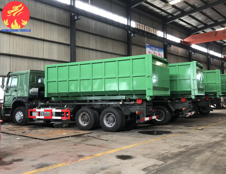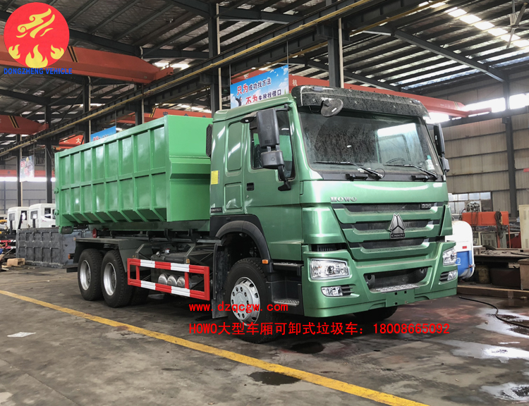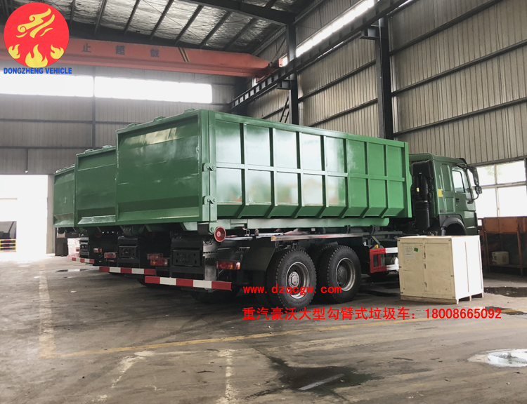 重汽豪沃后雙橋大型勾臂式垃圾車已下線,準備發往港口。