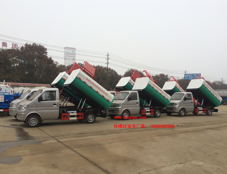 該車型符合國五排放標準,單排駕駛室,2760mm軸距,渝安70馬力汽油發動機,5檔箱,前盤后鼓式剎車,165/70R14真空胎,上裝容積約3個方。該車型的主要優勢在于車型小機動性強,一個車能配幾十個垃圾廂,能實現一臺車與多個垃圾廂聯合作業,循環運輸,充分提高了車輛的運輸能力,通常用于街道兩側的垃圾桶內垃圾的收集運用。