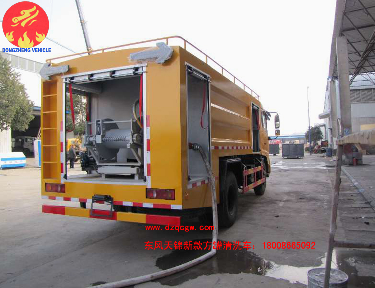 該東風天錦新款方罐清洗車的配置如下:采用3800mm軸距,康機180馬力,內配24Mpa清洗泵,高質量液壓伸縮卷盤。60米高壓管,10個碳鋼噴頭。
